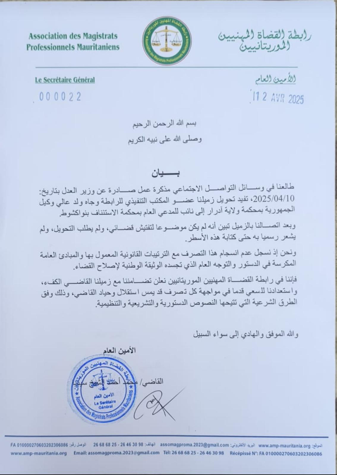 رابطة القضاة تحتج على تحويل وكيل الجمهورية في آدرار وتؤكد تضامنها معه