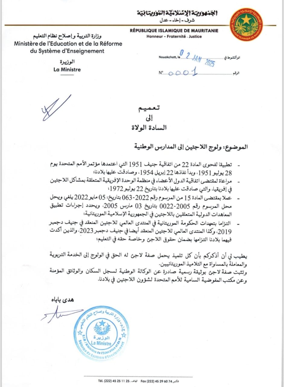 وزارة التهذيب الوطني: منح التلاميذ اللاجئين حق التعليم على قدم المساواة مع الموريتانيين**