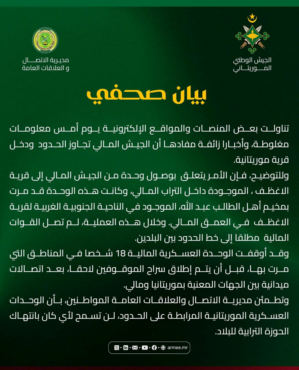 الجيش الموريتاني ينفي انتهاك الحدود ويؤكد جاهزيته لحماية السيادة
