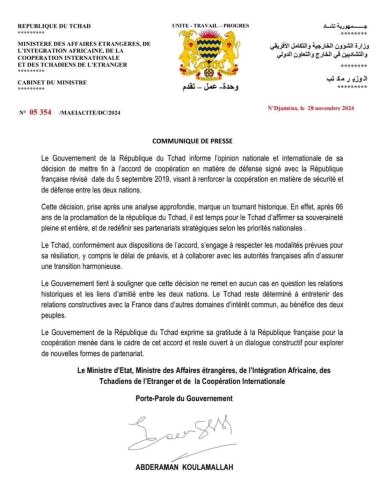 أعلنت وزارة الخارجية التشادية، مساء الخميس، إنهاء الاتفاقيات العسكرية الموقعة مع فرنسا، والتي خضعت لمراجعة عام 2019.