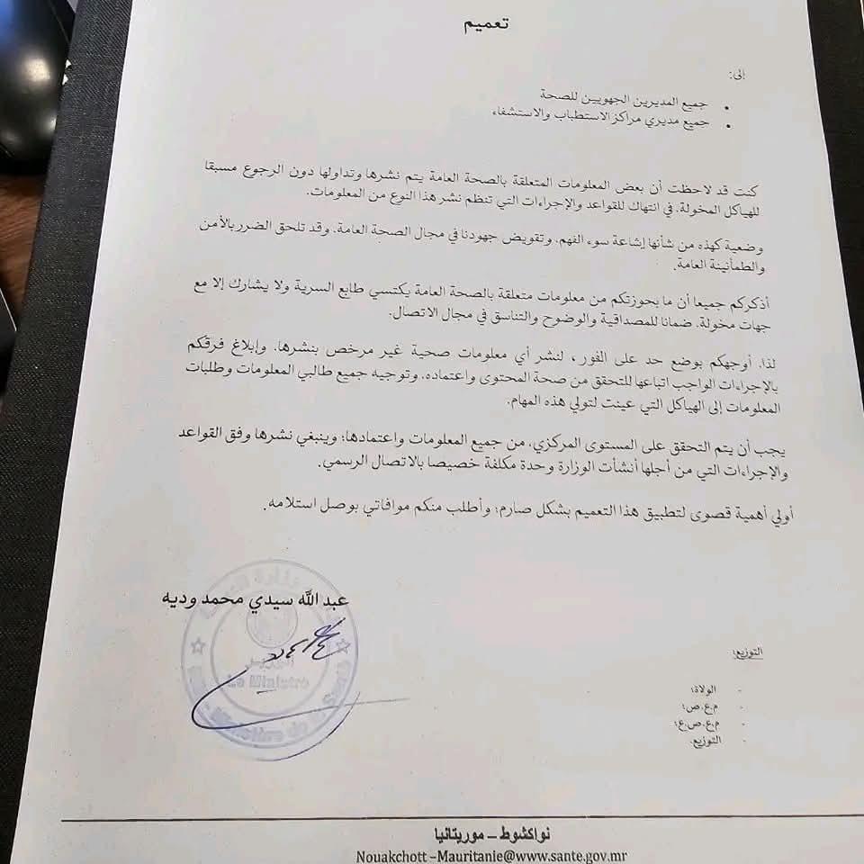 أصدر وزير الصحة عبد الله سيدي محمد وديه تعميما إلى المديرين الجهويين للصحة ومديري مراكز الاستطباب .