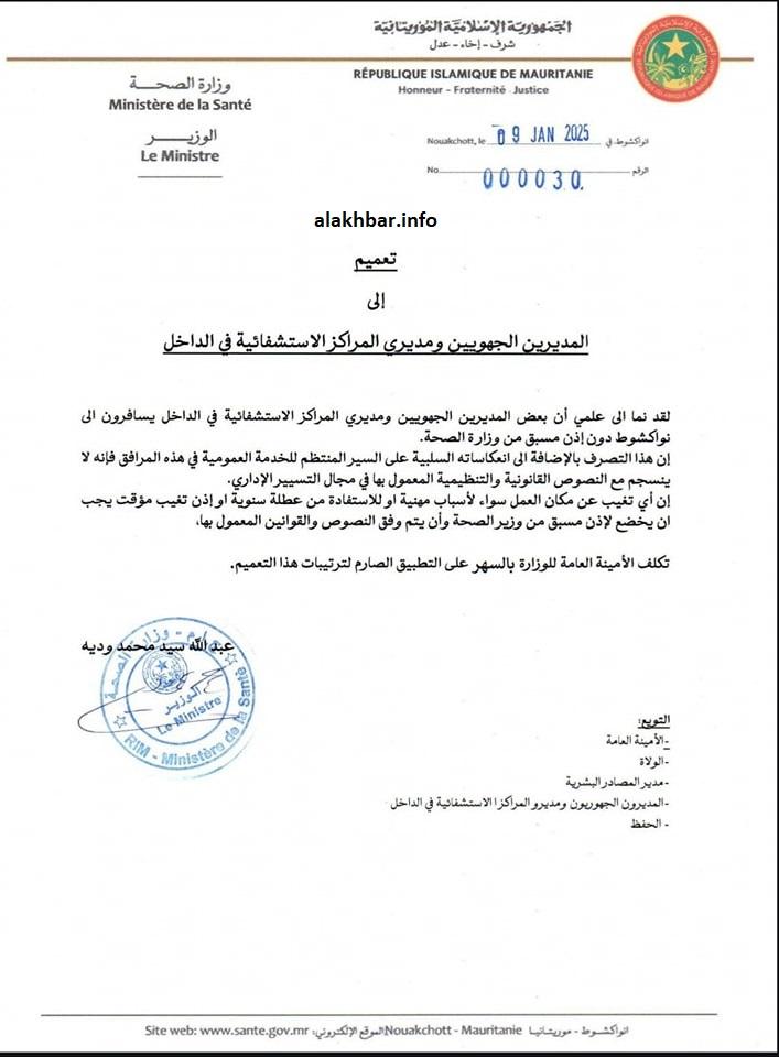 كما كلّف الوزير الأمينة العامة للوزارة بمتابعة تنفيذ هذا التعميم بشكل دقيق، مشيراً إلى ملاحظات وردت بشأن سفر بعض المديرين الجهويين ومديري المراكز الاستشفائية إلى نواكشوط دون الحصول على إذن مسبق، وهو ما اعتبره تجاوزاً للنظم الإدارية والقانونية المعتمدة.