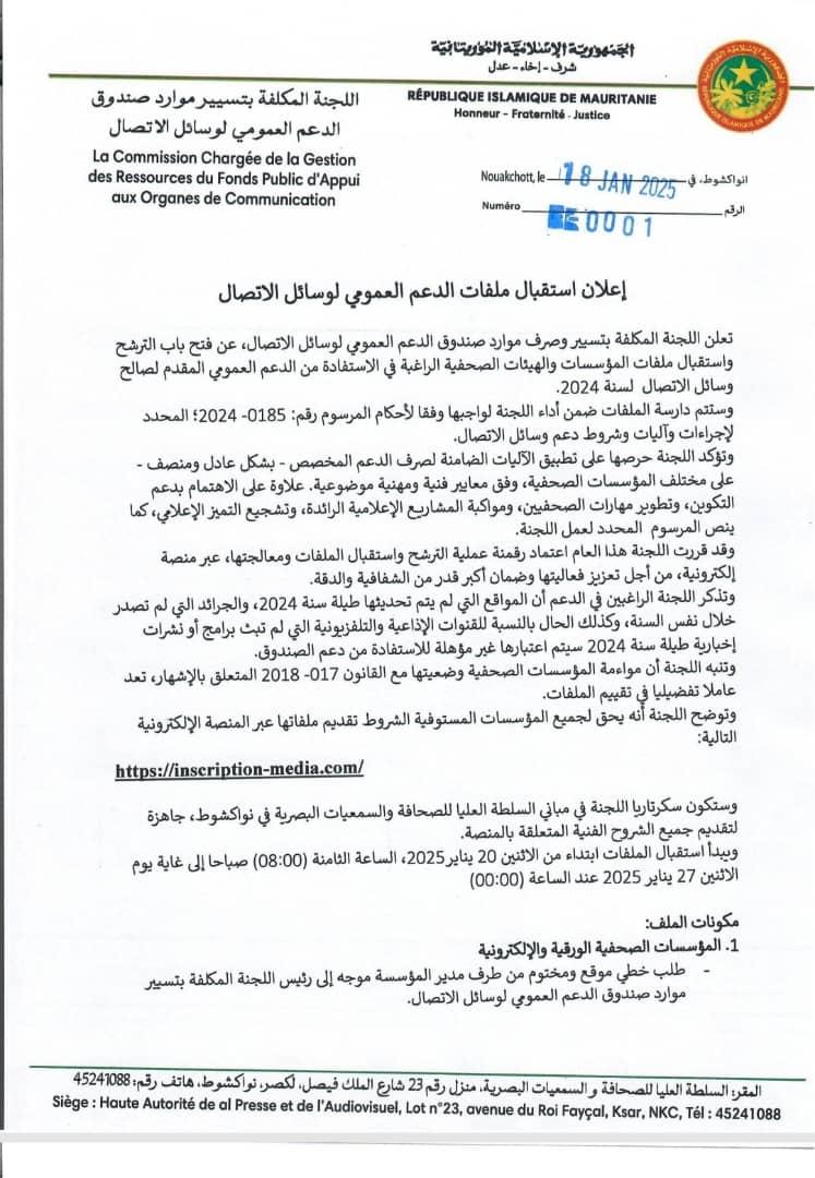 ودعت اللجنة الراغبين في الاستفادة إلى التوجه للسكرتيريا بمباني السلطة العليا للصحافة والسمعيات البصرية في نواكشوط للحصول على التوضيحات اللازمة.