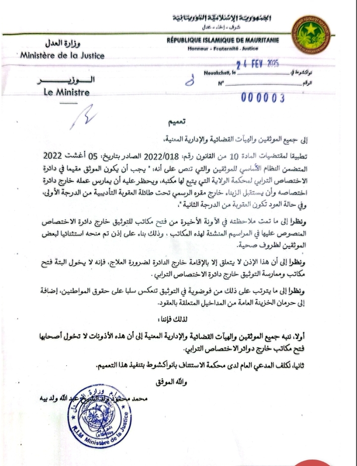 وفي هذا السياق، أوضح التعميم أن محكمة الاستئناف بنواكشوط مكلفة بمتابعة تنفيذ هذا القرار، لضمان التزام جميع الموثقين بالقانون.
