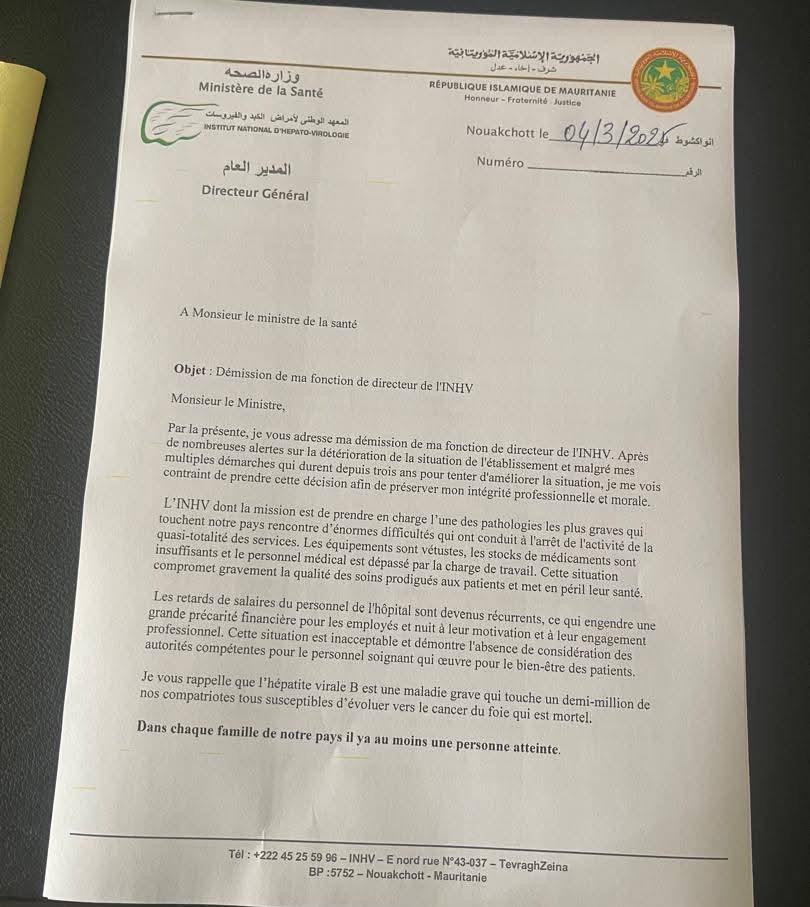 قدم البروفيسور المصطفى محمدو مناه، المدير العام للمعهد الوطني لأمراض الكبد والفيروسات، استقالته إلى وزارة الصحة، مبررًا قراره بالأوضاع الصعبة التي يعاني منها المعهد منذ سنوات. وأوضح في رسالته الموجهة إلى وزير الصحة أن الاستقالة جاءت بعد سلسلة من التحذيرات التي وجهها حول التدهور المستمر في الوضع داخل المؤسسة، مما أثر على الأسس المهنية والأخلاقية التي تقوم عليها. ورغم الجهود المستمرة التي بذلها مع فريقه لتحسين الظروف، إلا أن التحديات التي واجهها كانت أكبر من أن تُتجاوز.