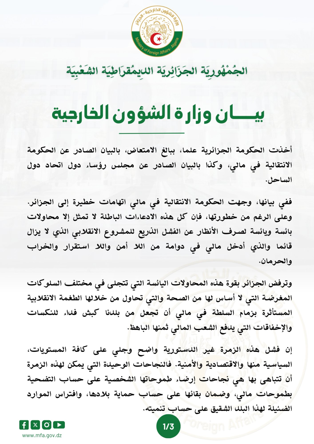وانتقدت الجزائر بشدة ما وصفته بـ”الانحياز غير المدروس” من النيجر وبوركينا فاسو إلى جانب مالي، مستنكرة “اللغة غير اللائقة” التي استُخدمت ضدها، ومؤكدة رفضها لما اعتبرته “محاولات يائسة لتحميلها مسؤولية إخفاقات السلطة الانقلابية في مالي”.