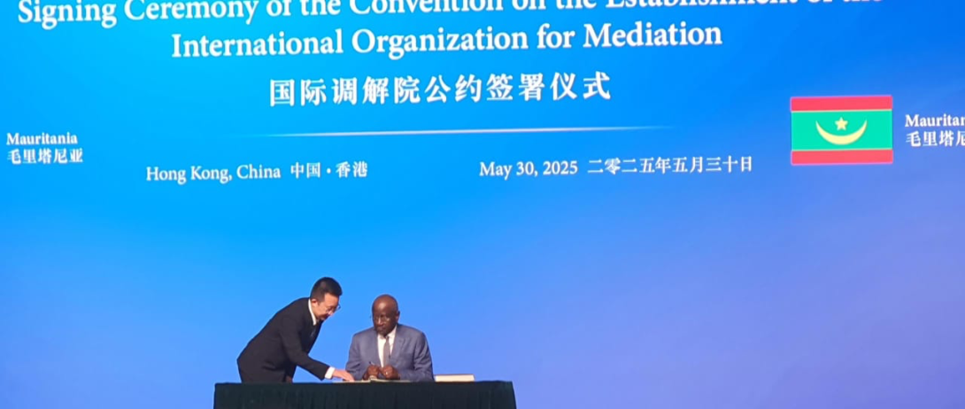شهدت مدينة هونغ كونغ الصينية، اليوم الجمعة، مشاركة وفد موريتاني رفيع المستوى في حفل توقيع اتفاقية إنشاء المنظمة الدولية للوساطة، وذلك في إطار مبادرة تقودها الصين لتعزيز الحلول السلمية للنزاعات بين الدول.