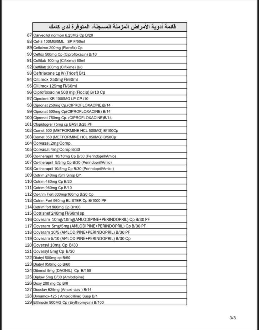 أكدت مركزية شراء الأدوية والمستلزمات الطبية "كامك" توفر أدوية الأمراض المزمنة المسجلة لدى وزارة الصحة بشكل كافٍ في المخازن المركزية، مشيرة إلى أن توزيعها يتم وفق آلية مرقمنة تضمن الشفافية والانسيابية.