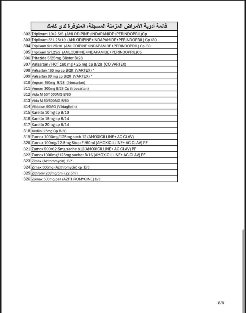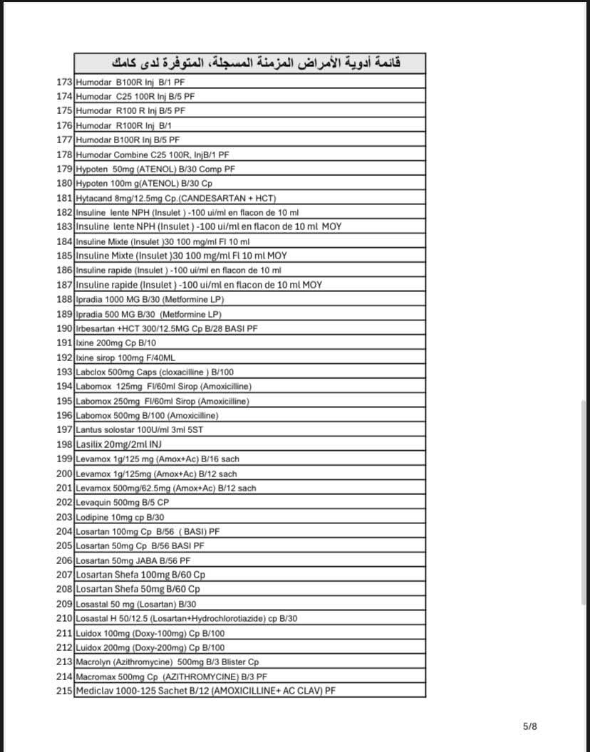 وأوضحت "كامك" أن عدد الأصناف المتوفرة يتجاوز 320 صنفًا دوائيًا مسجلاً، تشمل علاجات أساسية لأمراض مثل السكري، والضغط، والقلب، ومضادات التخثر.