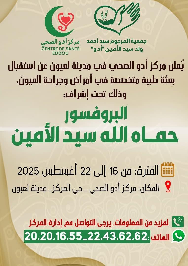 Jul 29 / التعليقات بعثة طبية مختصة بامراض وجراحة العيون تزور ولاية الحوض الغربي أعلن مركز "أدو الصحي"في مدينة لعيون عن استقبال بعثة طبية متخصصة في أمراض وجراحة العيونالبعثة ستزور لعيون في الفترة 16 حتي 22 أغسطس برئاسة لبروفسير حماه الله ولد سيد المين