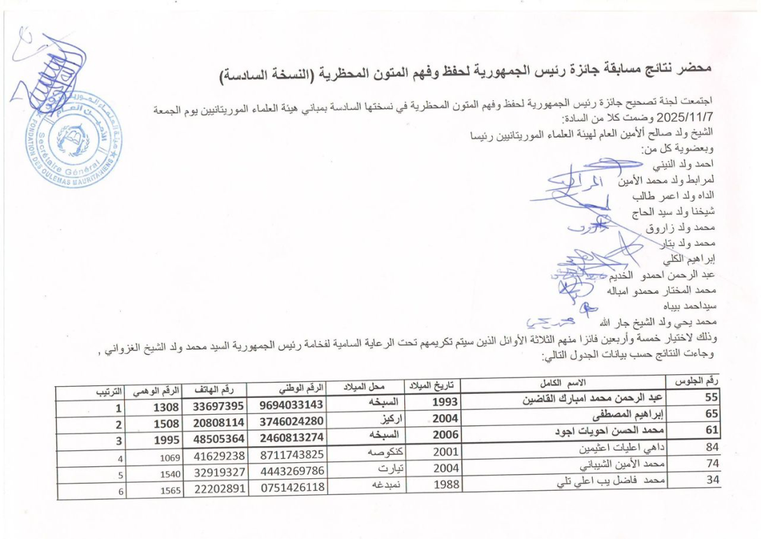 في الخامس والعشرين من نوفمبر الفين وخمسة وعشرين أعلنت وزارة الشؤون الإسلامية والتعليم الأصلي في نواكشوط يوم الثلاثاء عن أسماء الفائزين في النسخة السادسة من جائزة رئيس الجمهورية لحفظ وفهم المتون المحظرية وقد شملت القائمة خمسة وأربعين فائزا جاء في مقدمتهم عبد الرحمن محمد امبارك يليه إبراهيم المصطفى ثم محمد الحسن احويات أجود في المركز الثالث