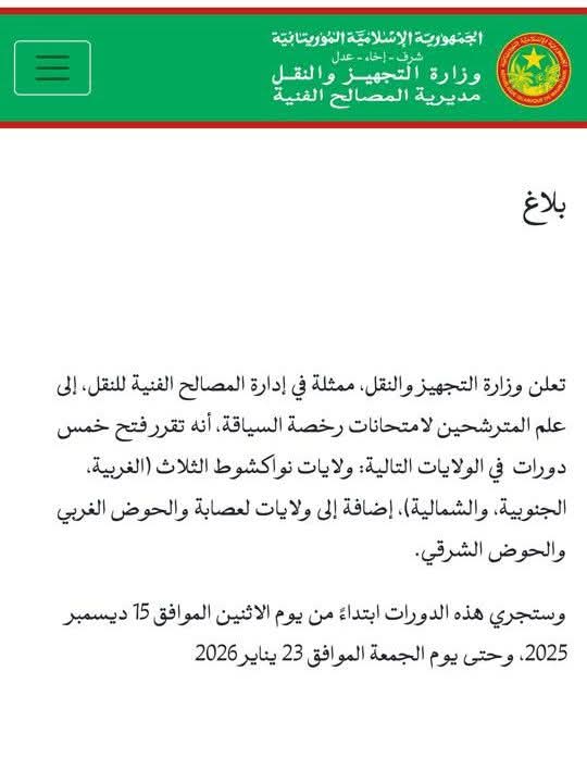أعلنت وزارة التجهيز والنقل، ممثلة في إدارة المصالح الفنية للنقل، عن فتح ست دورات لامتحانات رخصة السياقة في عدة ولايات.