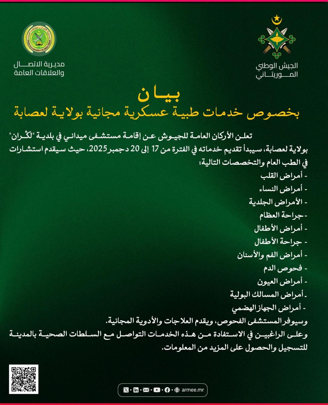 أعلنت الأركان العامة للجيوش عن تنظيم خدمات طبية عسكرية مجانية لصالح سكان ولاية لعصابة، عبر إقامة مستشفى ميداني بمدينة "لگران" ، وذلك خلال الفترة من 17 إلى 20 ديسمبر 2025.