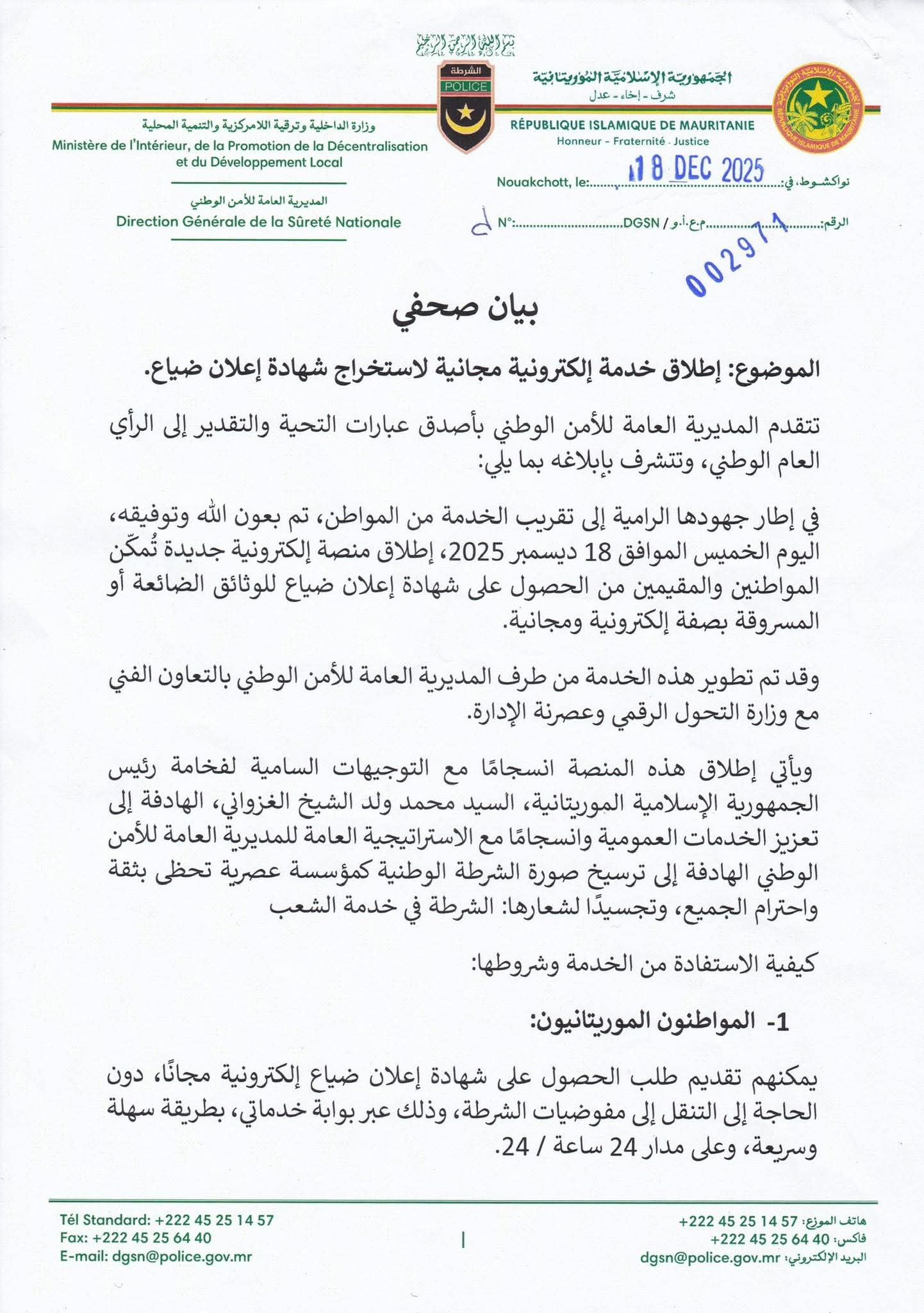 وأكد البيان أن إطلاق هذه الخدمة جاء ثمرة تعاون فني بين المديرية العامة للأمن الوطني ووزارة التحول الرقمي وعصرنة الإدارة، وانسجامًا مع التوجيهات السامية لفخامة رئيس الجمهورية محمد ولد الشيخ الغزواني، الهادفة إلى تعزيز الخدمات العمومية وترسيخ صورة شرطة وطنية عصرية قريبة من المواطن، وتجسيدًا لشعارها: الشرطة في خدمة الشعب.