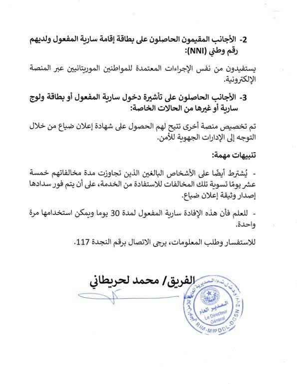 وبيّنت أن الخدمة متاحة للمواطنين الموريتانيين، وللأجانب المقيمين الحاصلين على بطاقة إقامة سارية المفعول ورقم وطني (NNI)، وفق نفس الإجراءات الإلكترونية، فيما خُصصت منصة أخرى للأجانب الحاصلين على تأشيرة دخول أو بطاقة ولوج سارية، مع إمكانية التوجه إلى الإدارات الجهوية للأمن في بعض الحالات الخاصة.