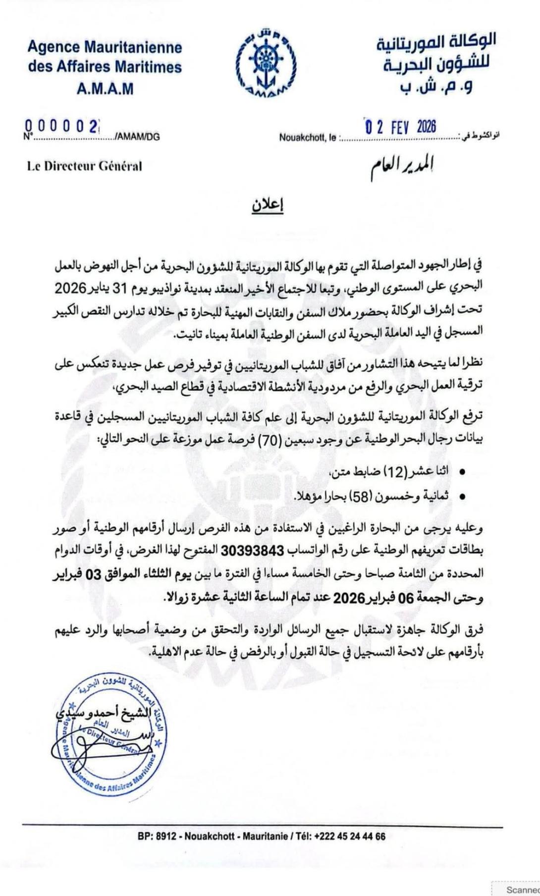 أعلنت الوكالة الموريتانية للشؤون البحرية، عن توفر 70 فرصة عمل جديدة لصالح البحارة الموريتانيين المسجلين في قاعدة بيانات رجال البحر الوطنية، وذلك في إطار جهودها لتعويض النقص المسجل في اليد العاملة البحرية وتعزيز التشغيل في قطاع الصيد البحري.