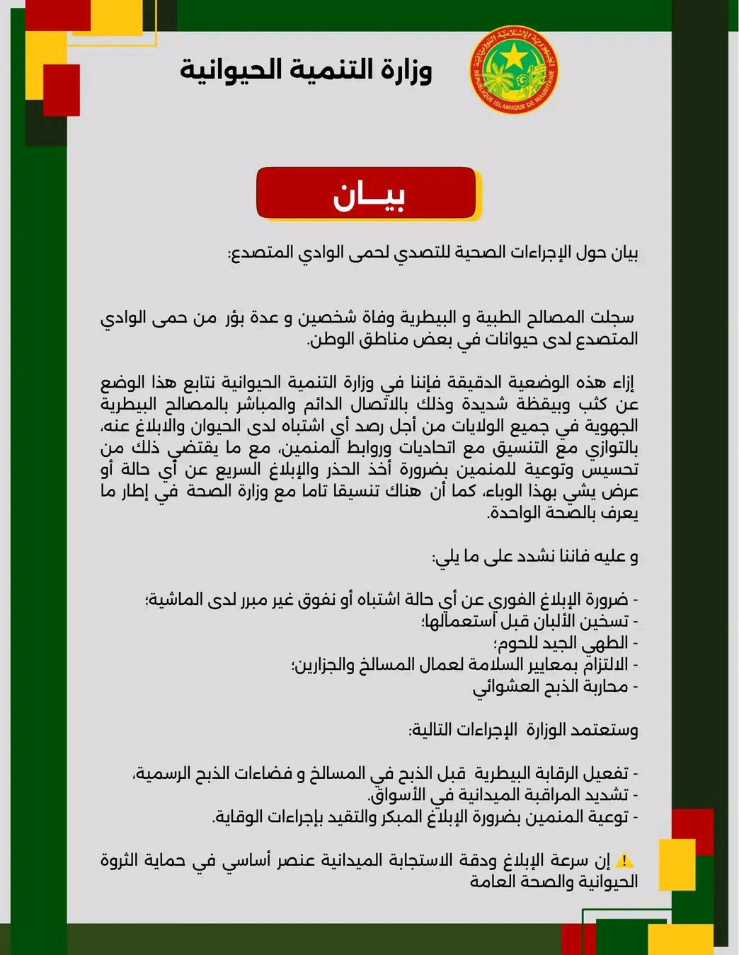 بيان حول الإجراءات الصحية للتصدي لحمى الوادي المتصدع