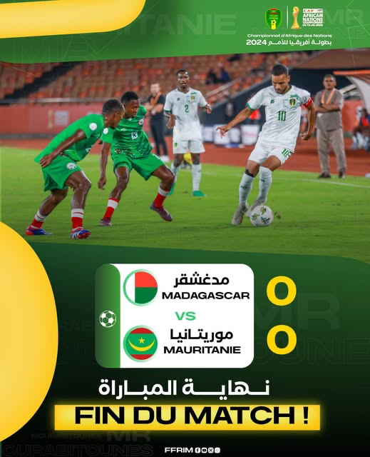 انتهت مباراة المنتخب الوطني الموريتاني (المرابطون) أمام نظيره منتخب مدغشقر بالتعادل السلبي، في اللقاء الذي أقيم مساء الأحد 3 أغسطس 2025، على ملعب بينجامين مكابا في مدينة دار السلام.