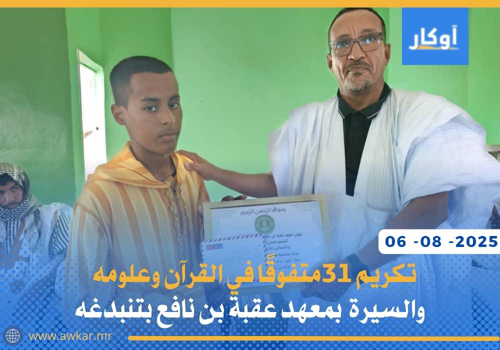 نظم معهد عقبة بن نافع لتعليم القرآن وعلومه والعلوم الشرعية بمدينة تمبدغه حفلا تكريميا مميزا احتفاء بختام عام دراسي اتسم بالجد والاجتهاد، تم خلاله تكريم 31 تلميذا متفوقا ممن برزوا في مسابقة علمية نظمها المعهد في علوم القرآن الكريم والسيرة النبوية الشريفة.