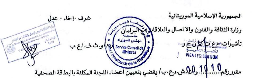 أصدر وزير الثقافة والفنون والاتصال والعلاقات مع البرلمان، الناطق باسم الحكومة، الحسين ولد مدو، مقررًا بتشكيل اللجنة المكلفة بالبطاقة الصحفية، تطبيقًا لأحكام قانون الصحفي المهني.