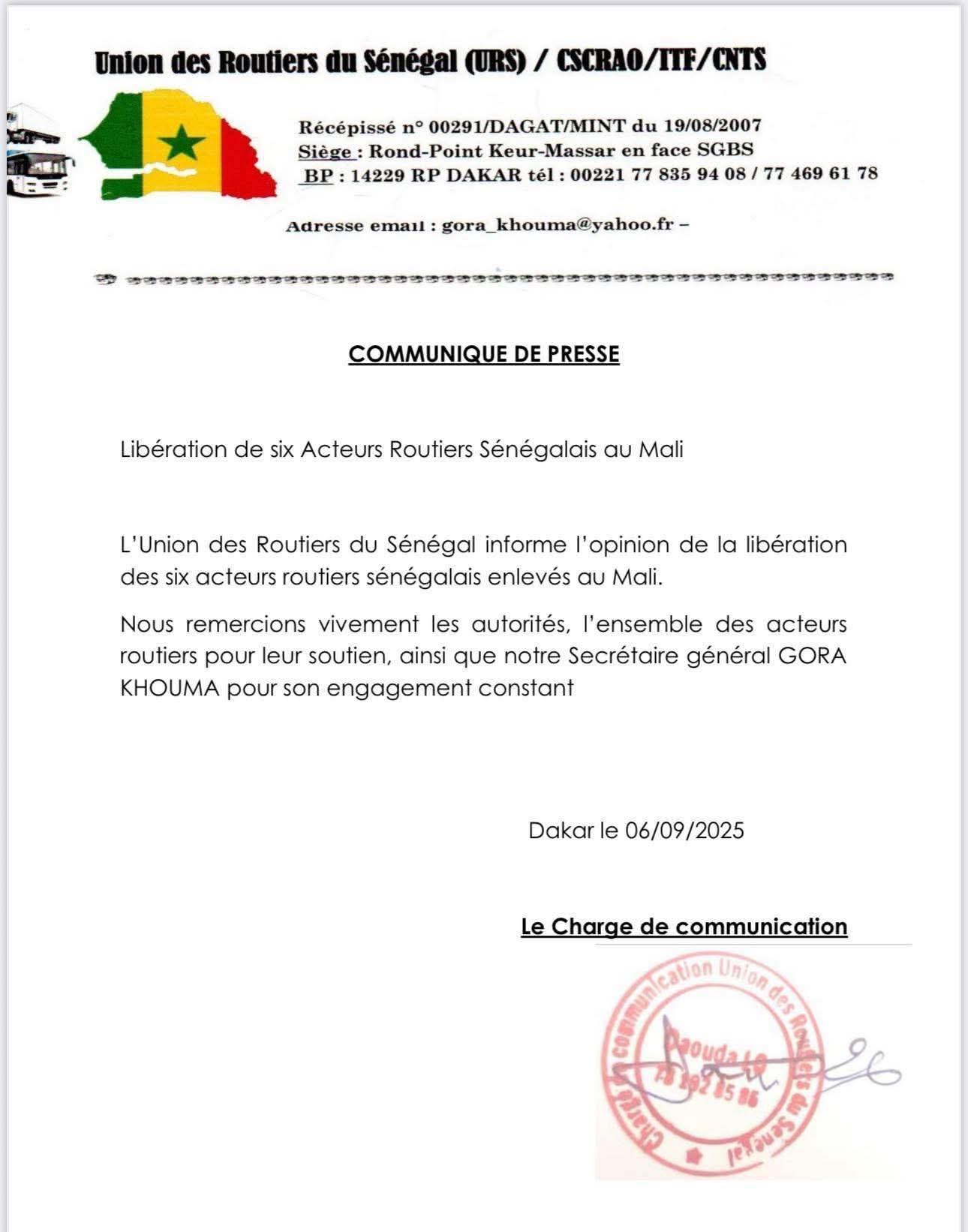 أعلن اتحاد سائقي السنغال، اليوم السبت في داكار، الإفراج عن السائقين السنغاليين الستة الذين اختطفتهم جماعة إرهابية الخميس الماضي بين بلدتي "خاي" و"سيغالا" غربي مالي.