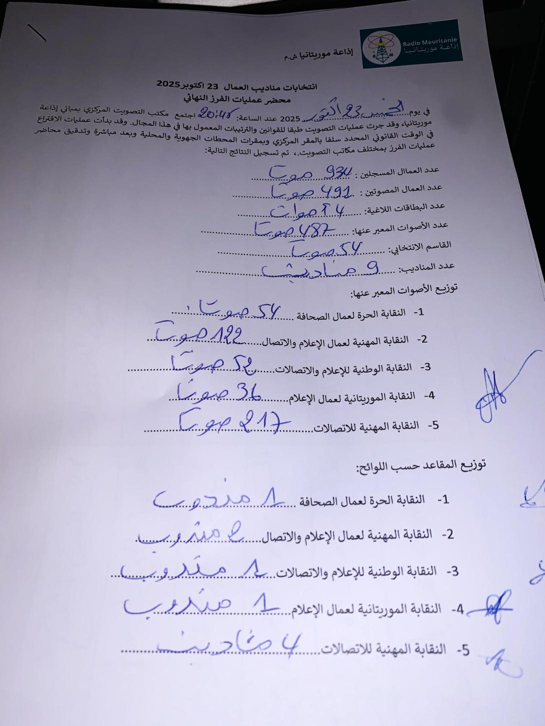 - النقابة الموريتانية لعمال الإعلام: 36 صوتًا، وحصلت على مقعد واحد