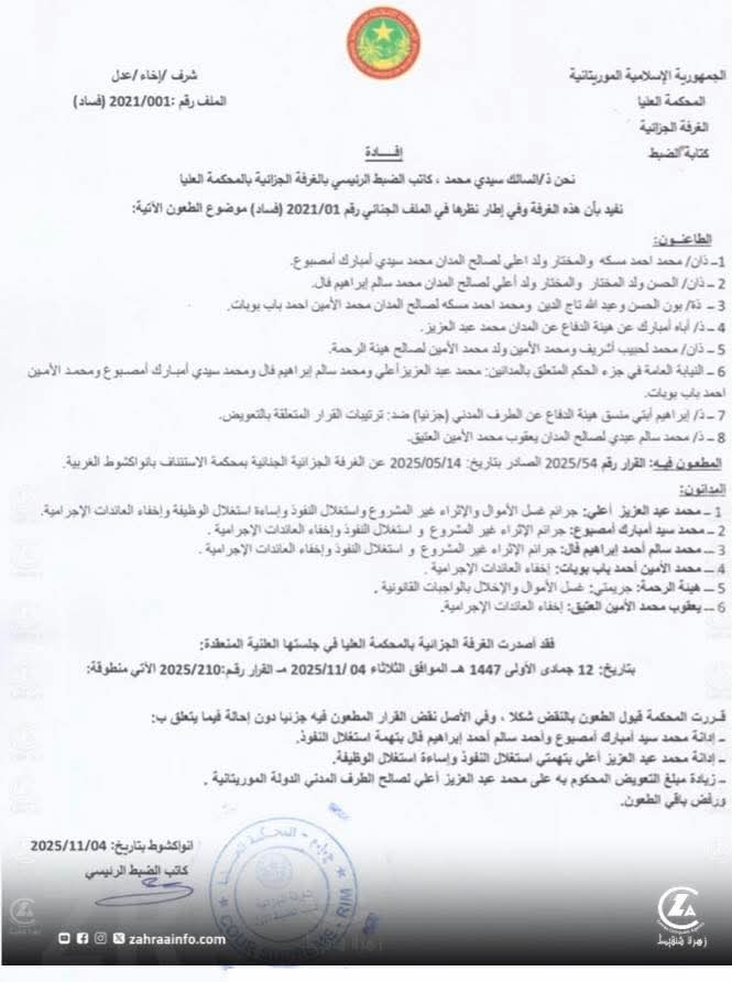 أكدت المحكمة العليا اليوم الأحكام الصادرة بحق الرئيس السابق محمد ولد عبد العزيز، وذلك بتثبيت عقوبة السجن لمدة 15 سنة نافذة.