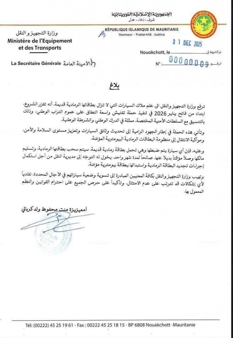 نواكشوط أعلنت وزارة التجهيز والنقل عزمها إطلاق حملة وطنية واسعة لسحب البطاقات الرمادية القديمة للمركبات وذلك ابتداء من فاتح يناير 2026 في إطار جهودها الرامية إلى تحديث وثائق السيارات وتعزيز السلامة والأمن على الطرق