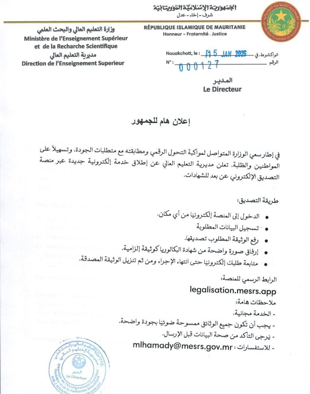 أعلنت وزارة التعليم العالي والبحث العلمي عن إطلاق خدمة رقمية جديدة لتصديق الشهادات عن بُعد، وذلك عبر منصة التصديق الإلكتروني، في خطوة تهدف إلى تسهيل الإجراءات الإدارية وتقريب الخدمات من المواطنين.