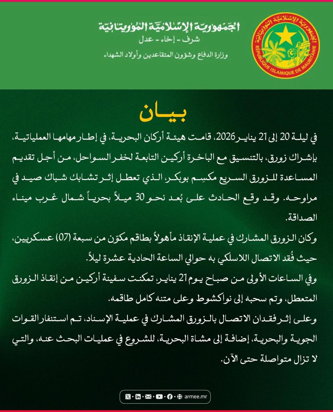 أعلن الجيش الموريتاني فقدان الاتصال بزورق عسكري كان يشارك في عملية إنقاذ، فيما تستمر جهود البحث المكثفة جويا وبريا وبحريا لتحديد موقعه.