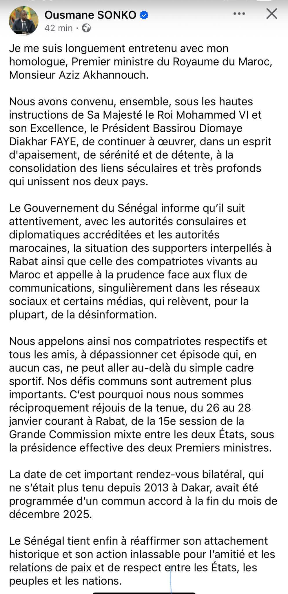 أجرى رئيس الوزراء السنغالي، عثمان سونكو، اتصالًا هاتفيًا مع نظيره المغربي، عزيز أخنوش، تناول أوضاع الجالية السنغالية في المغرب، وذلك عقب المباراة النهائية لكأس أمم إفريقيا التي جمعت المنتخبين السنغالي والمغربي
