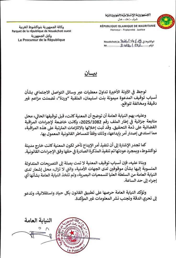 كما تجدر الإشارة إلى أن تنفيذ أمر الإيداع تأخر لكون المعنية كانت خارج مدينة نواكشوط، وبمجرد عودتها تم تنفيذ المذكرة الصادرة في حقها وفق الإجراءات القانونية.
